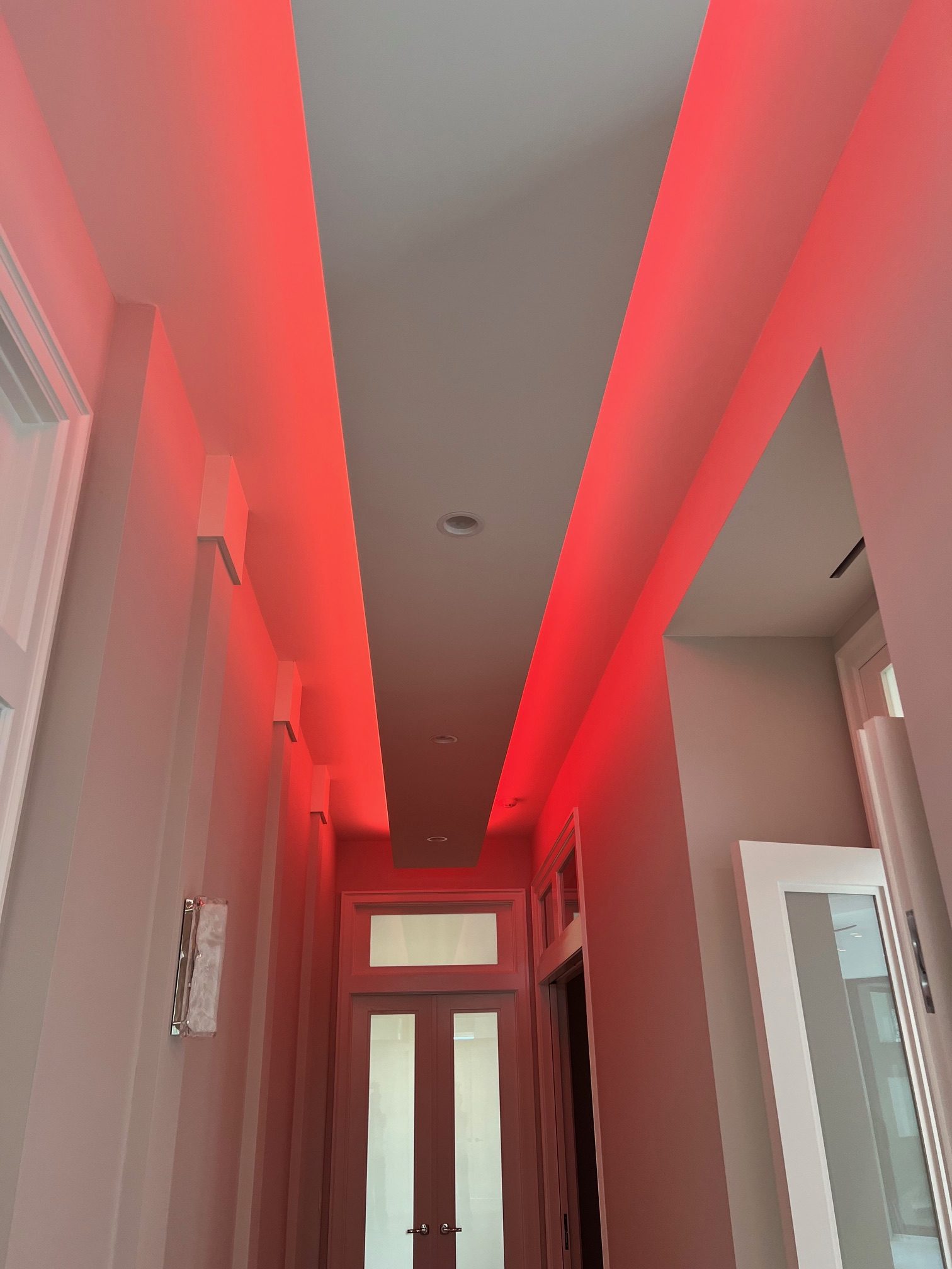 This 1st Place design uses RGB lighting to visually define and separate areas within a multi-compartmentalized ceiling, creating a dynamic and memorable atmosphere. In this stunning waterfront home, the lighting adds a bold layer of visual impact beyond the natural beauty of the shore.
