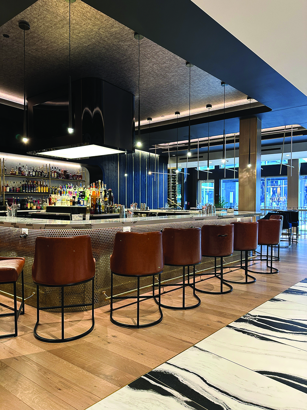 Awarded 1st Place, this project features LED linear cove lighting that elegantly guides the eye to a central bar, creating a strong focal point. Designed by Lighting Dynamics with Vocon Inc., the ceiling illumination wraps the restaurant on all sides, enhancing spatial flow. The bar’s uplighting showcases bottles, glassware, and detailed accents, while linear lighting on the entry steps adds a final touch of sophistication.
