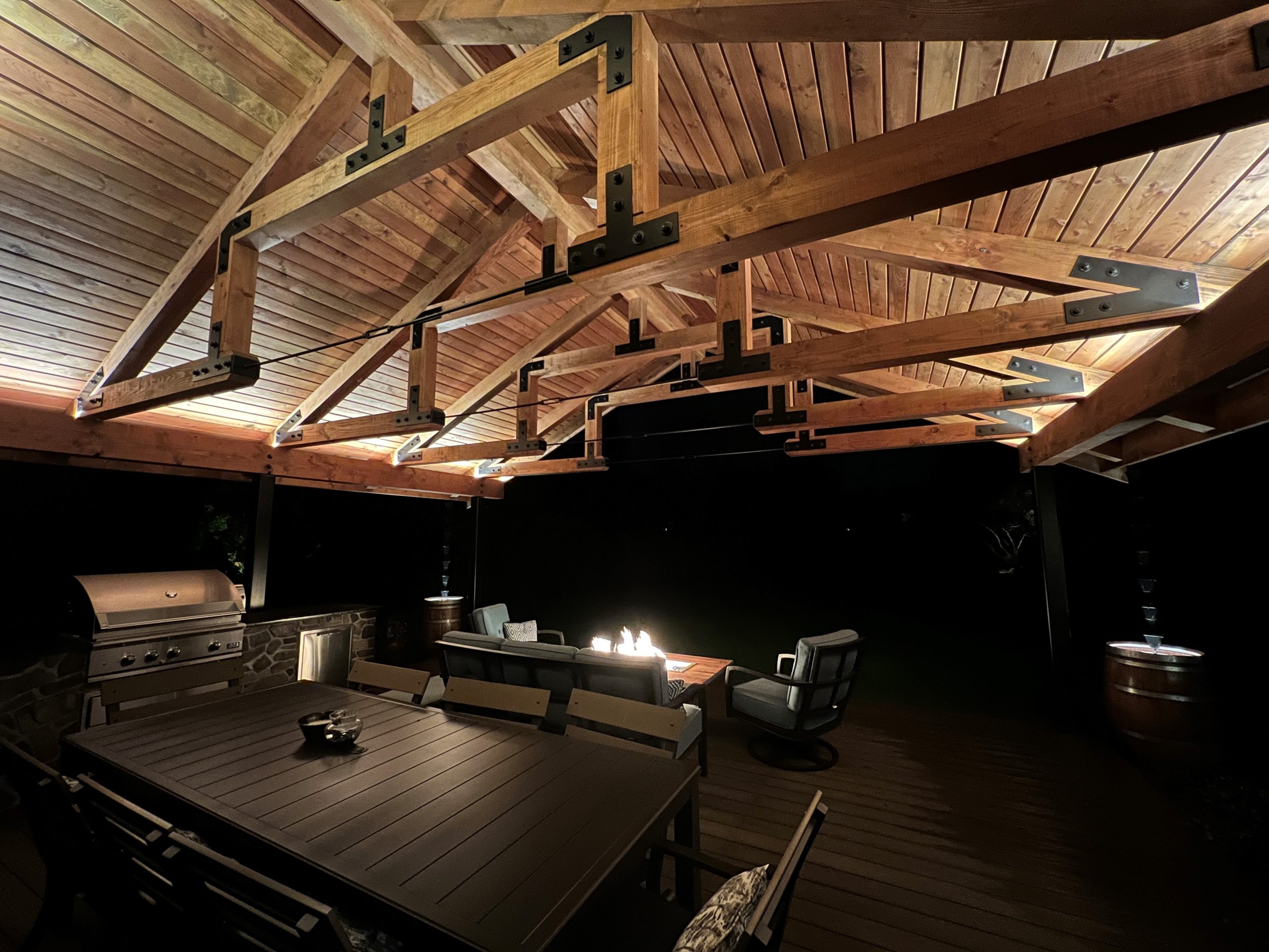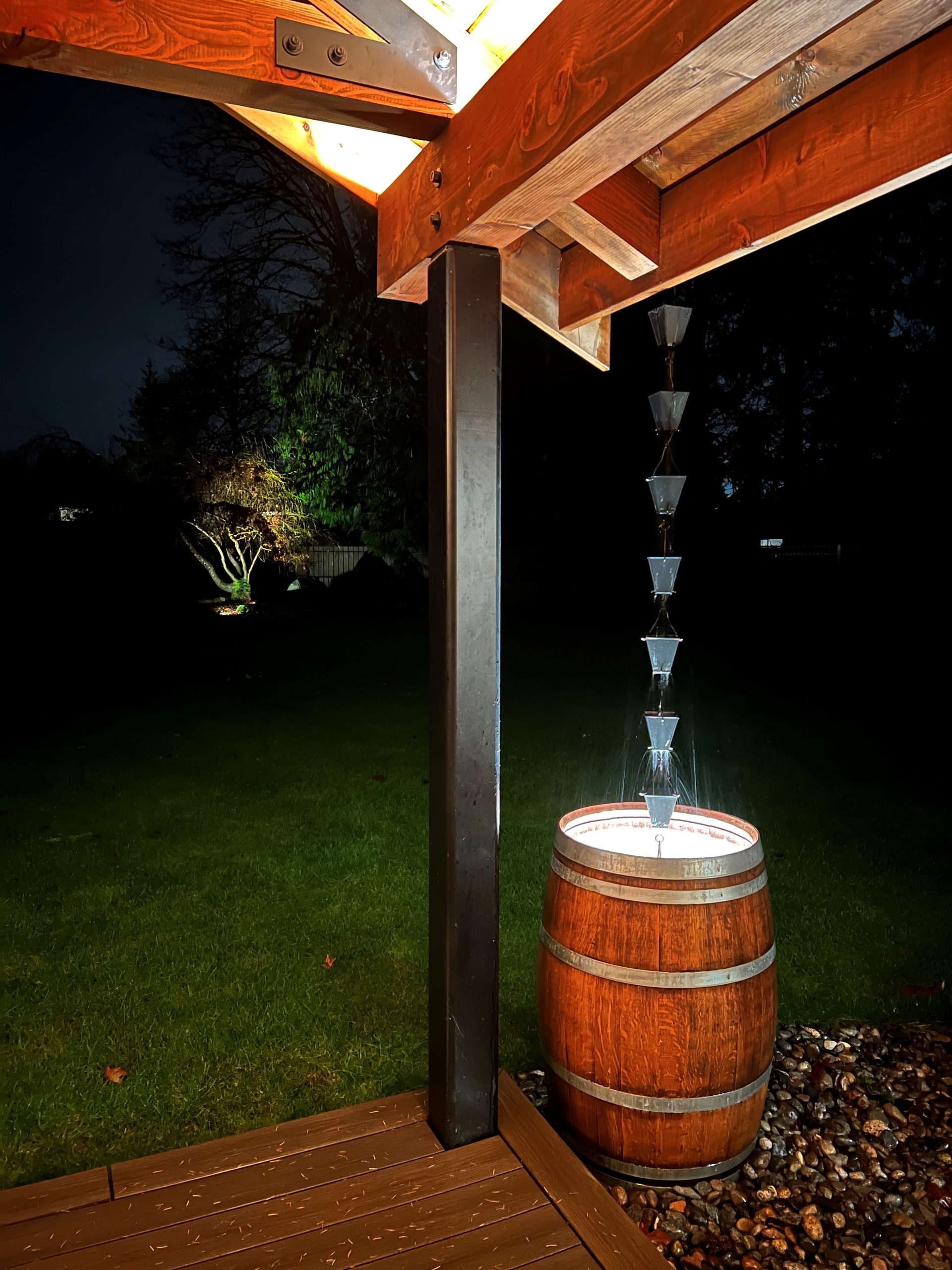 This 2nd Place outdoor lighting design transforms a patio into a vibrant showcase using LEDs on soffits and rain barrels. The creative illumination of the rain barrels in particular highlights the designer’s ingenuity, making the space both eye-catching and a source of homeowner pride.