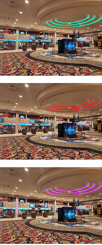 A fitting environment for 24VDC NeoVision24 RGBW is this theatre. Illuminating the round architectural ceiling cove is one of the industry’s most formidable RGBW source. All the purity, and rich color saturation that is associated with neon is available in a field cuttable and joinable tape. Available in side flex and top flex (depending on the direction of your curves), NeoVision24 is a great alternative to actual neon – and is guaranteed for 5 years!