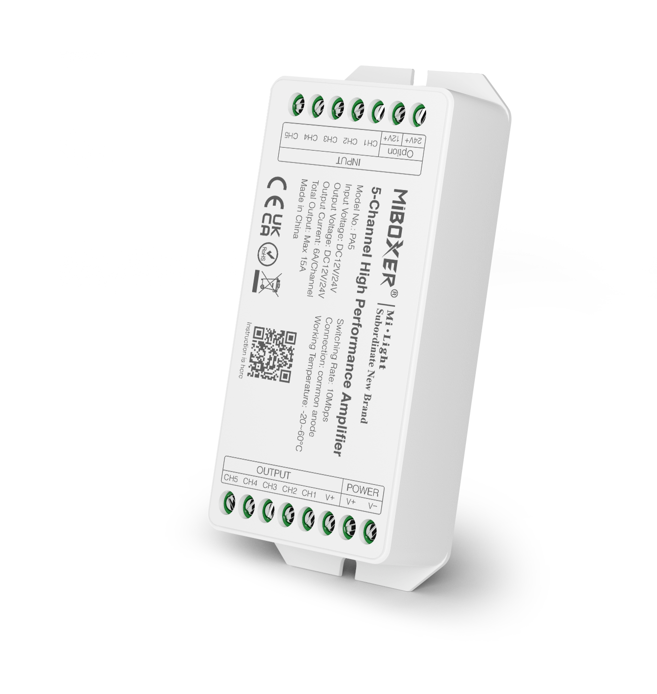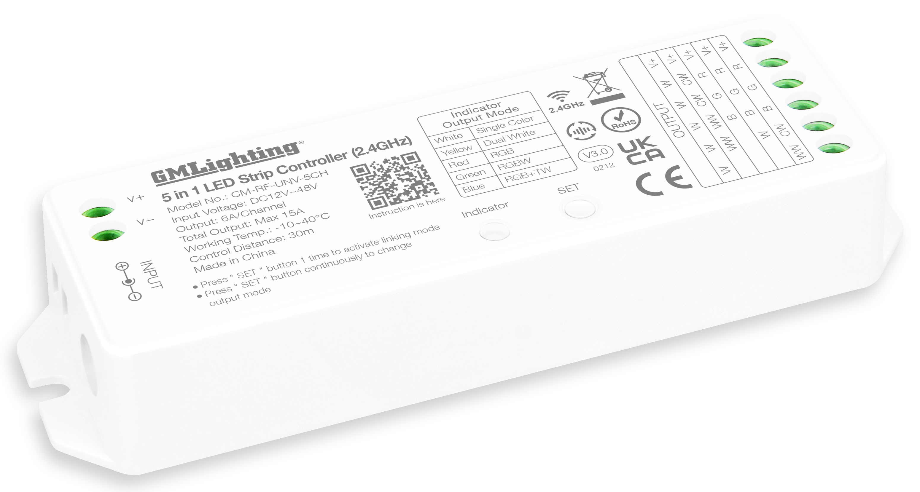 The GM Universal RF Control System is a versatile and reliable solution for a wide range of lighting applications. Designed for seamless control, this system supports 1 to 5 channel LED light sources, making it compatible with single-channel white LEDs, tunable white, and RGB configurations. It also accommodates RGB+White and RGB+CCT tuning, offering flexible lighting options for different environments. Simply match the power supply output to the LED voltage and power requirements, and enjoy effortless setup with 12V or 24V LED sources and power supplies. With wireless RF technology, this system provides easy operation without the need for complex Wi-Fi connections or internet access