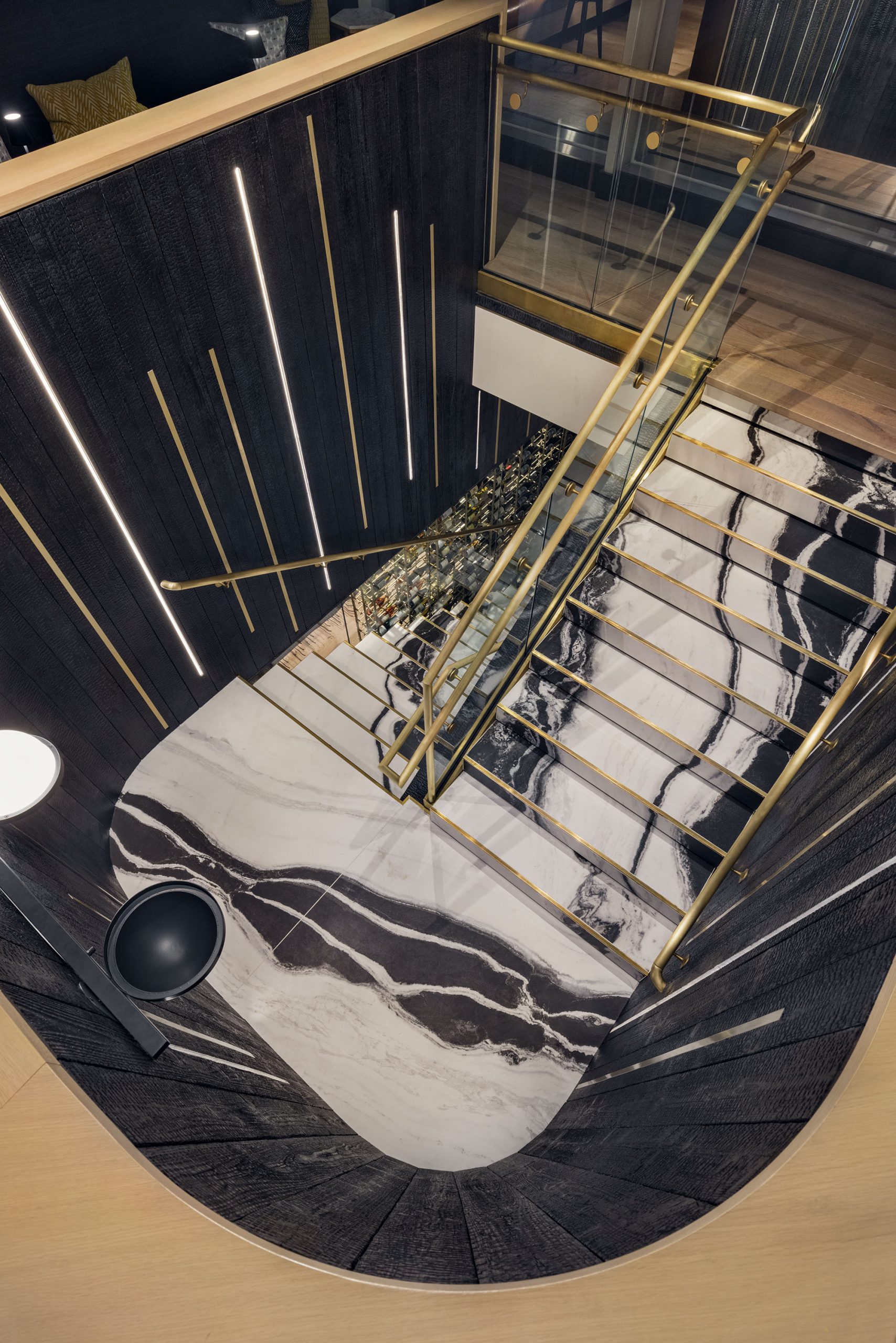 Awarded 1st Place, this project features LED linear cove lighting that elegantly guides the eye to a central bar, creating a strong focal point. Designed by Lighting Dynamics with Vocon Inc., the ceiling illumination wraps the restaurant on all sides, enhancing spatial flow. The bar’s uplighting showcases bottles, glassware, and detailed accents, while linear lighting on the entry steps adds a final touch of sophistication.