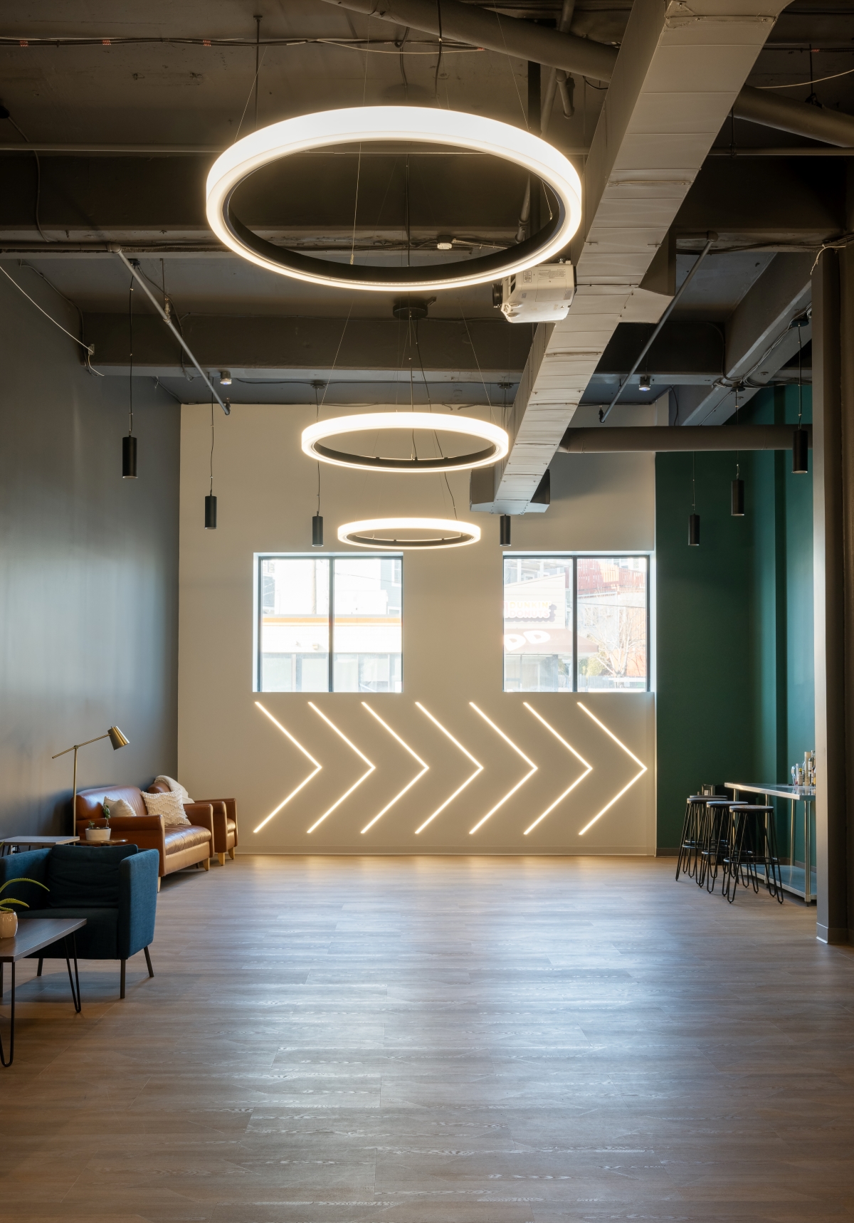 Awarded 2nd Place, this design blends circular suspended fixtures with angular linear LED wall accents to create a bold, tech-inspired environment. More than just illumination, the lighting defines the space’s identity, merging task and accent lighting to reflect the innovative nature of the business.